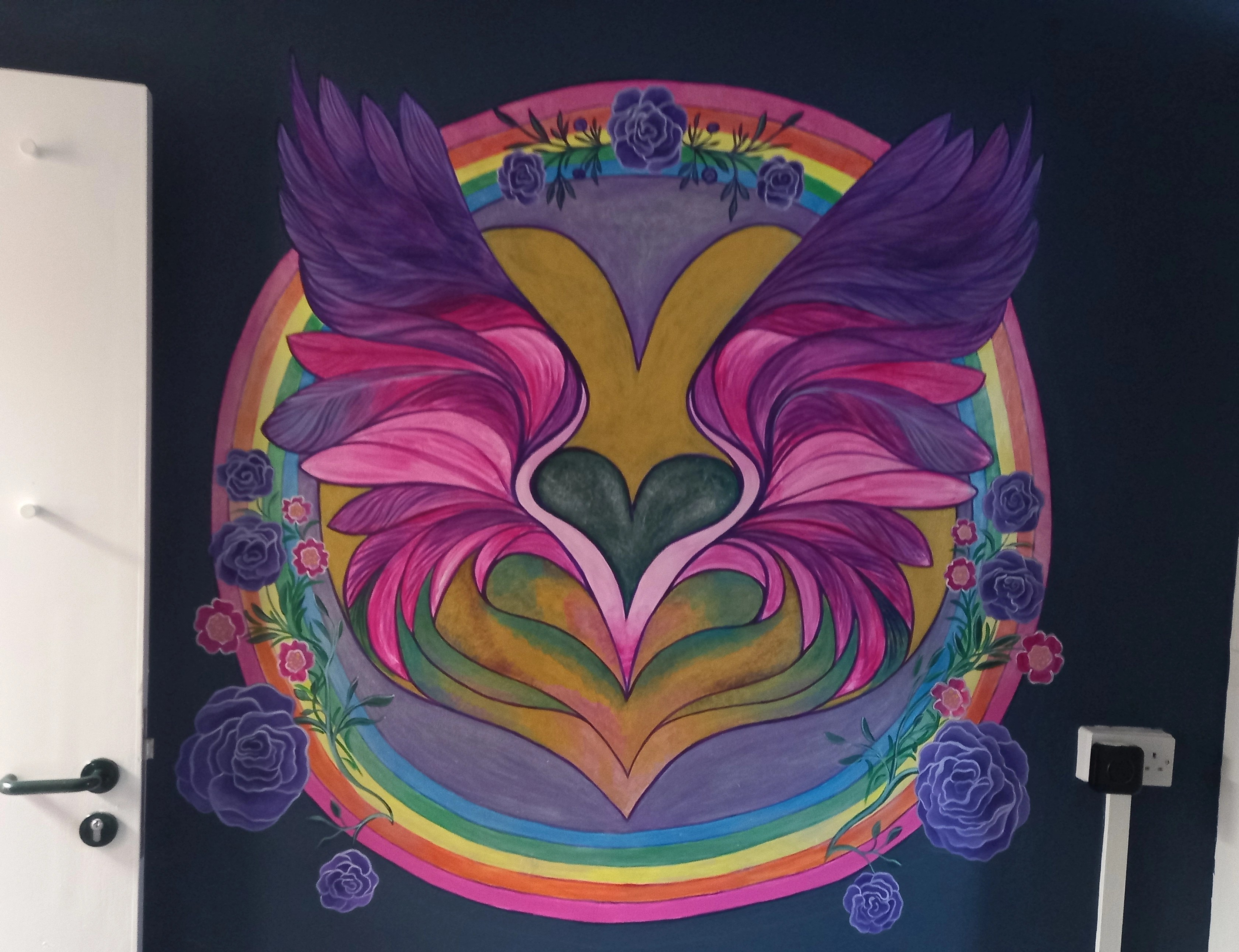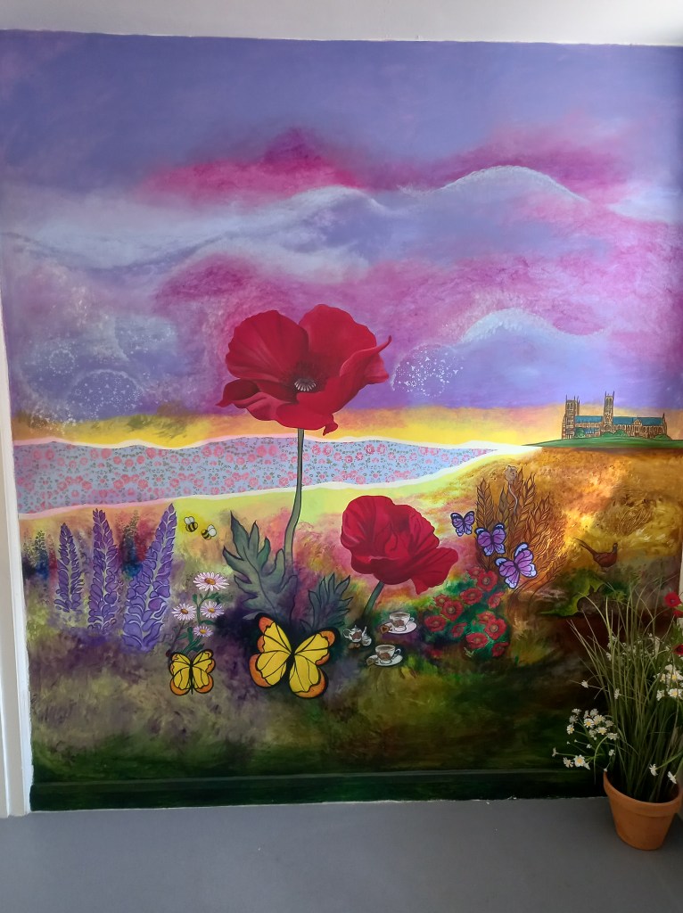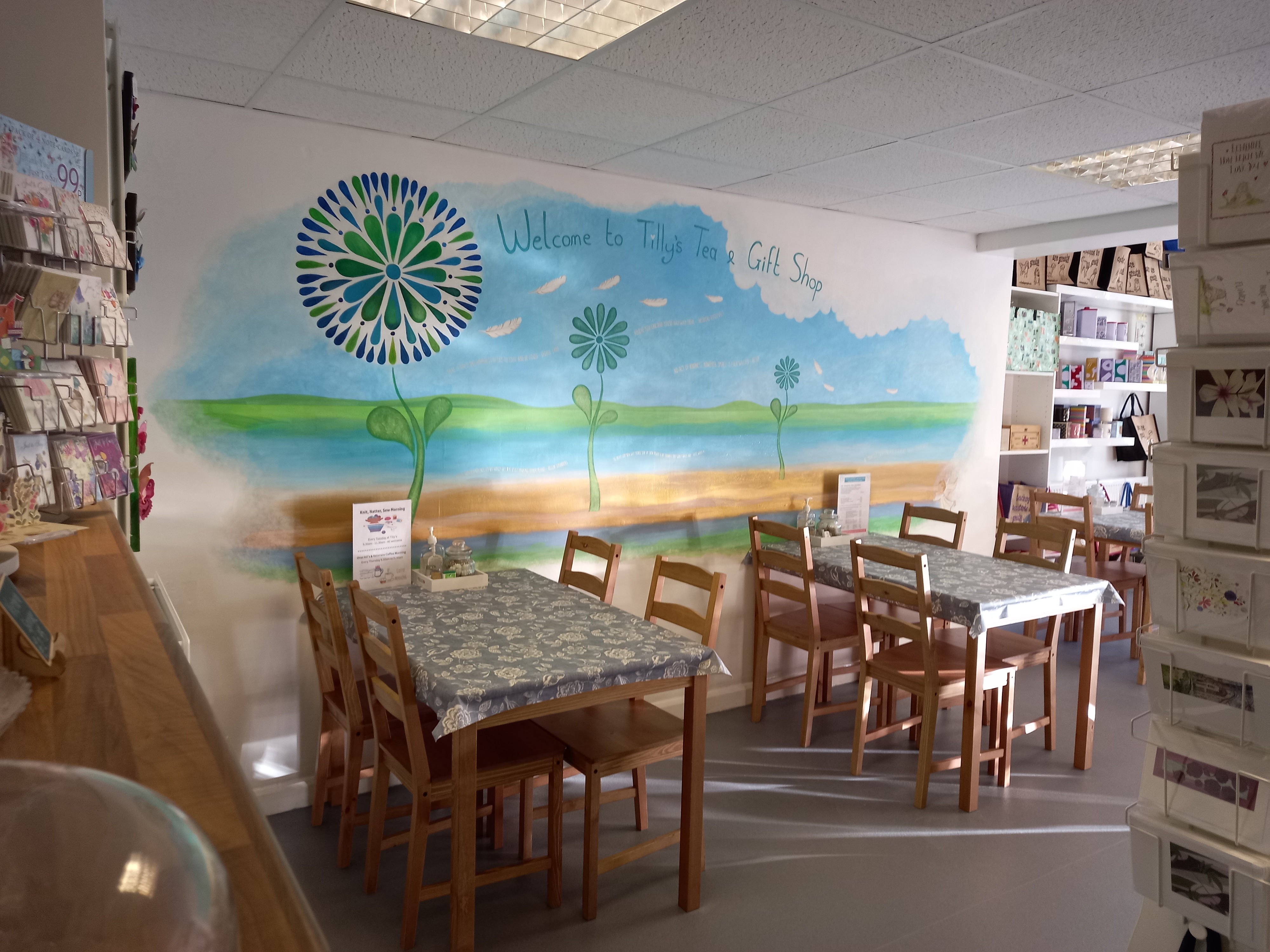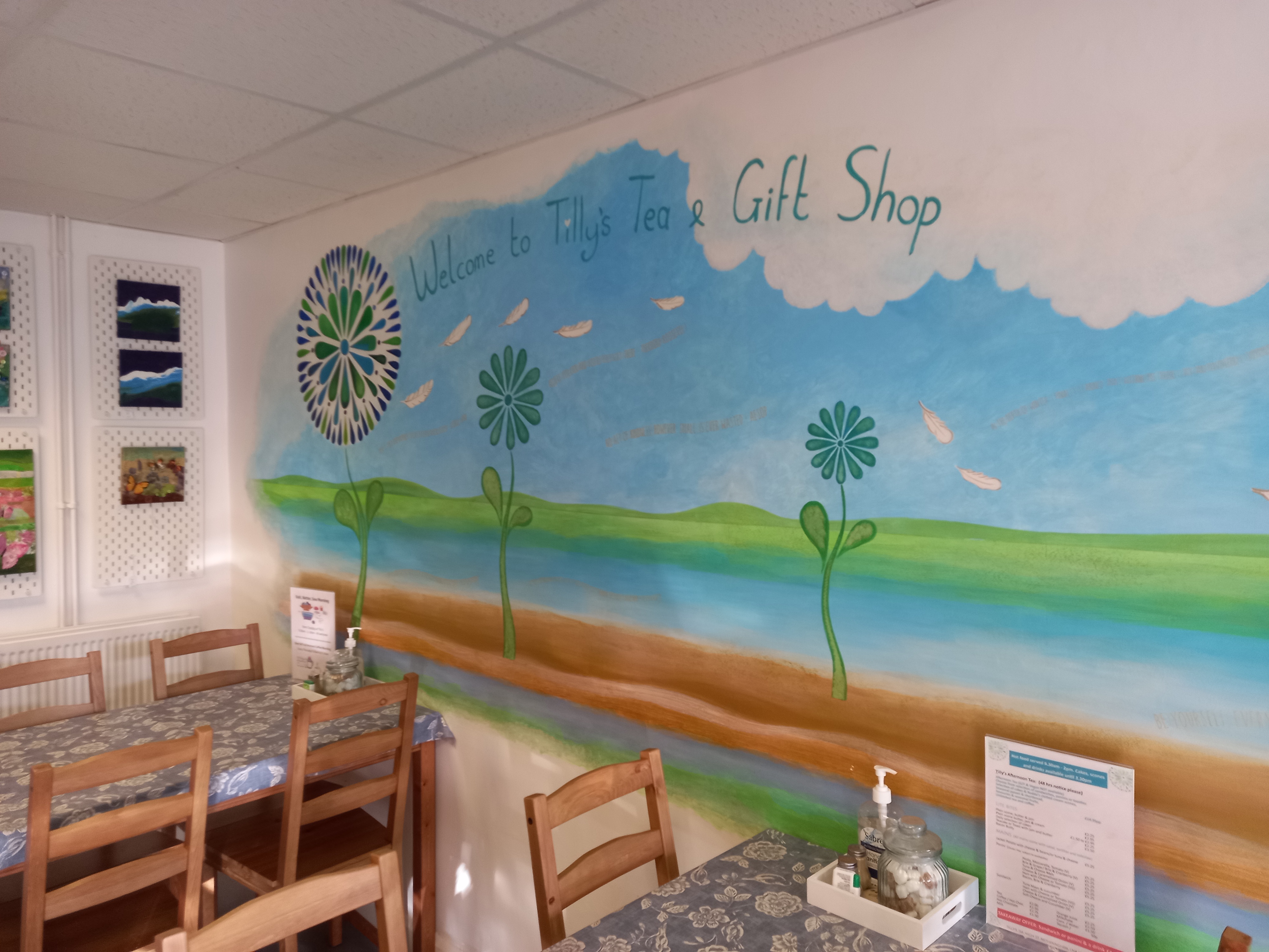 In 2020 Tilly’s Tea and Gift Shop in Metheringham, Lincolnshire, England, moved to a larger shop, where upon I created the main mural in the tea room in the front of the shop, based on the Tillys logo, as a branded mural. This was a gentle inspirational backdrop that coordinated with the colours of Tillys logo that became a giant flower. This mural no longer exists due to new owner.